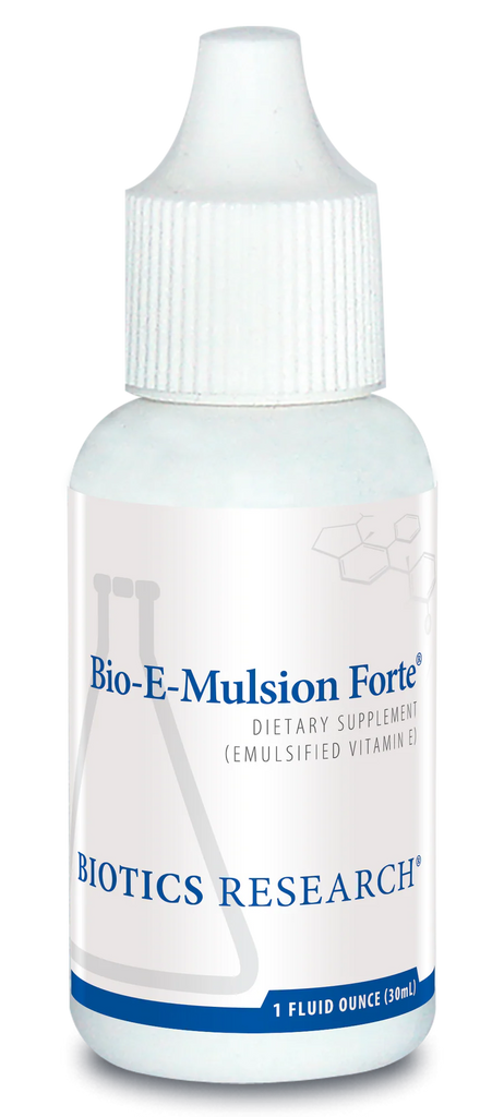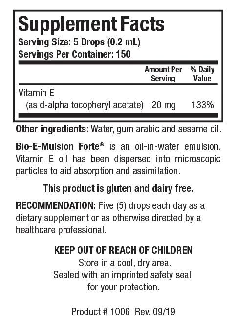 Bio-E-Mulsion Forte® supplies vitamin E in a liquid, emulsified form to aid with absorption and assimilation. Each drop provides 6 IU of vitamin E as d-alpha tocopheryl acetate (natural vitamin E).
